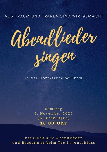 Abendliedersingen in der Wulkower Dorfkirche - diesmal am Samstagabend zu Allerheiligen: "Aus Traum und Tränen sind wir gemacht" - Alte und neue Abendlieder und die Ahnung von der Ewigkeit. Im Anschluss gibt es warmen Tee und die Gelegenheit zum Gespräch.