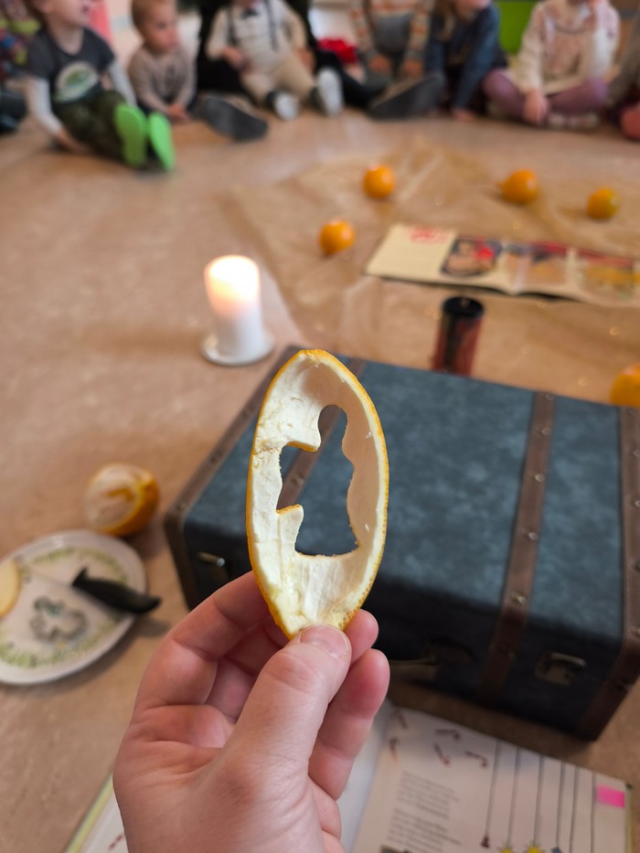 Wie riecht es eigentlich, wenn ein Engel im Raum ist? Die Kinder hatten ganz unterschiedliche Ideen. Manche sind sich ganz sicher, dass sie schon einem Engel begegnet sind. Vielleicht riechen Engel gerade im Advent ein bisschen wie Weihnachten? Zur Erinnerung an dieses herrliche gemeinsame Theologisieren haben wir aus Orangenschalen Engel ausgestochen und sie im Flur an den Adventsstrauß gehängt. Seitdem duftet es im Kindergarten und wer weiß, vielleicht ist gerade auch ein Engel in der Nähe!