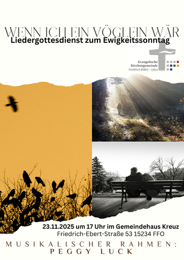 Der Gottesdienst zum Ewigkeitssonntag im Gemeindehaus Kreuz wird durch Peggy Luck musikalisch begleitet. Wir singen Volks- und Abendlieder, feiern Abendmahl und erinnern uns an diejenigen, die schon gestorben sind.